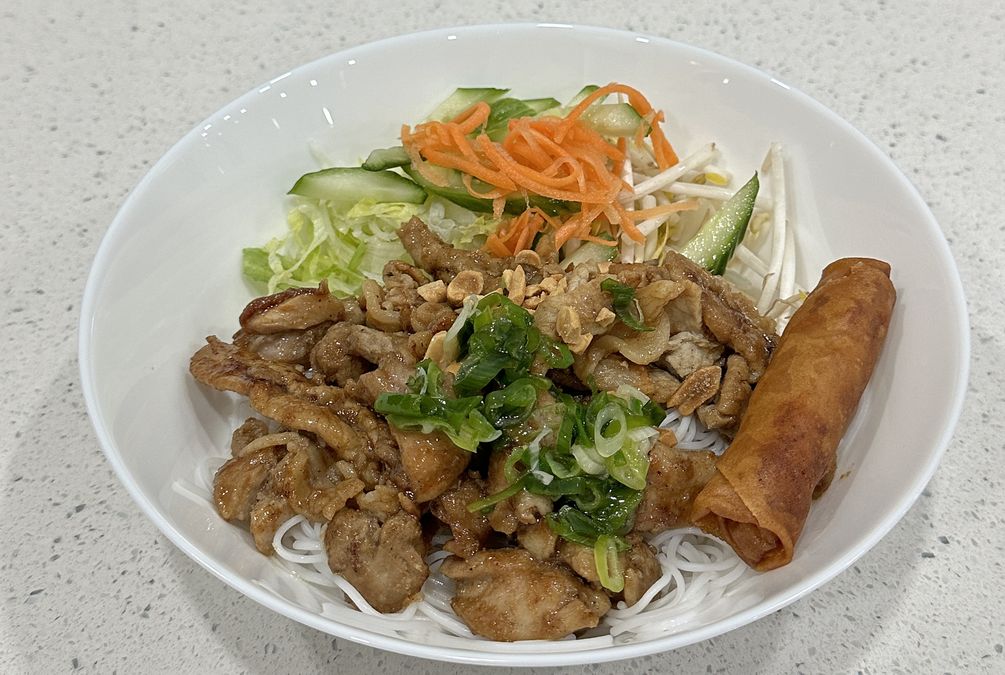 Our Three Color Vermicelli Bowl offers a perfect trio of toppings served with rice noodles, herbs, pickled vegetables, and roasted peanuts. Light yet filling, it’s served with house fish sauce for a refreshing, flavorful meal.