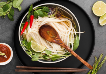 Phở Chay is a wholesome vegetarian take on Vietnam’s most beloved soup. A delicate, aromatic broth is simmered with spices, then served with rice noodles, tofu, mushrooms, and fresh vegetables. Healthy, flavorful, and soul-warming.